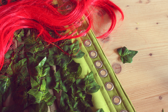 Pour moi je suis partie sur l’idée d’un corset long (histoire de ne pas non plus me balader en body-collant toute la soirée) recouvert de fausses feuilles de lierre.